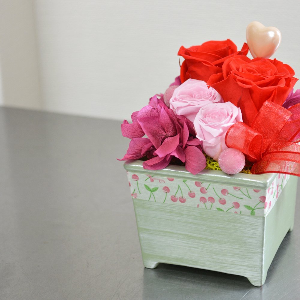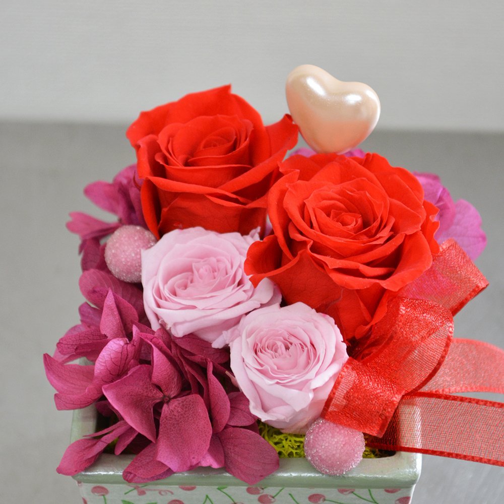 プリザーブドフラワー グリーンコンポート レッド&ピンクバラ アレンジメント クリアケース付 フラワーギフト 花ギフト ブリザーブドフラワー 母の日 ギフト