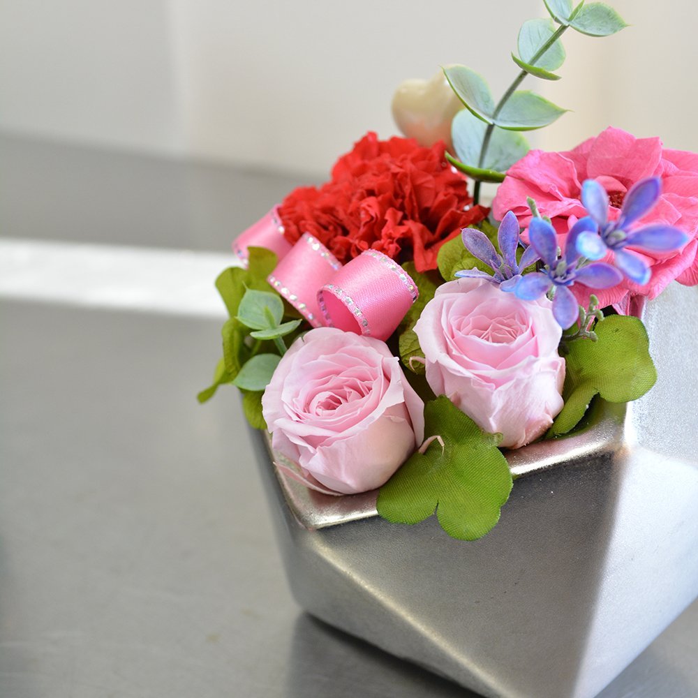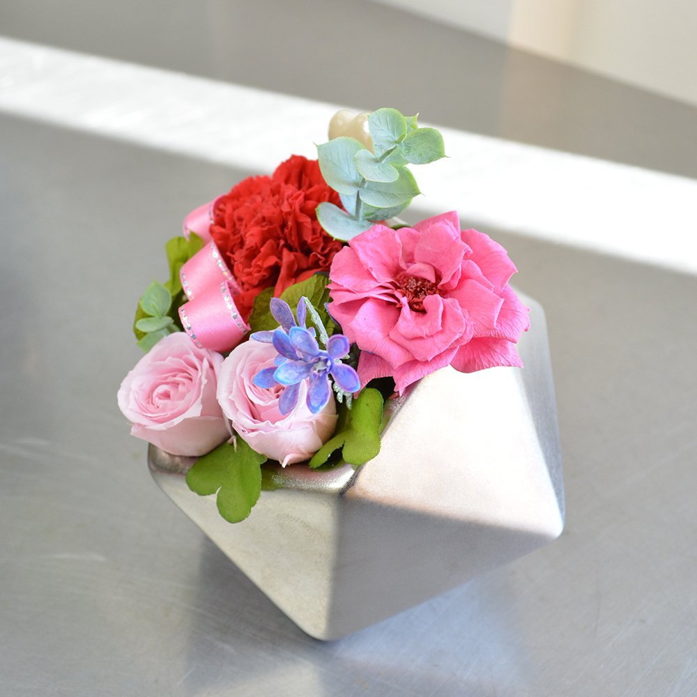 ★商品説明★多角形のシルバーポットにカーネーション、ばら、アジサイ(プリザーブドフラワー)でアレンジしました。こちらの商品はクリアケース付となります。