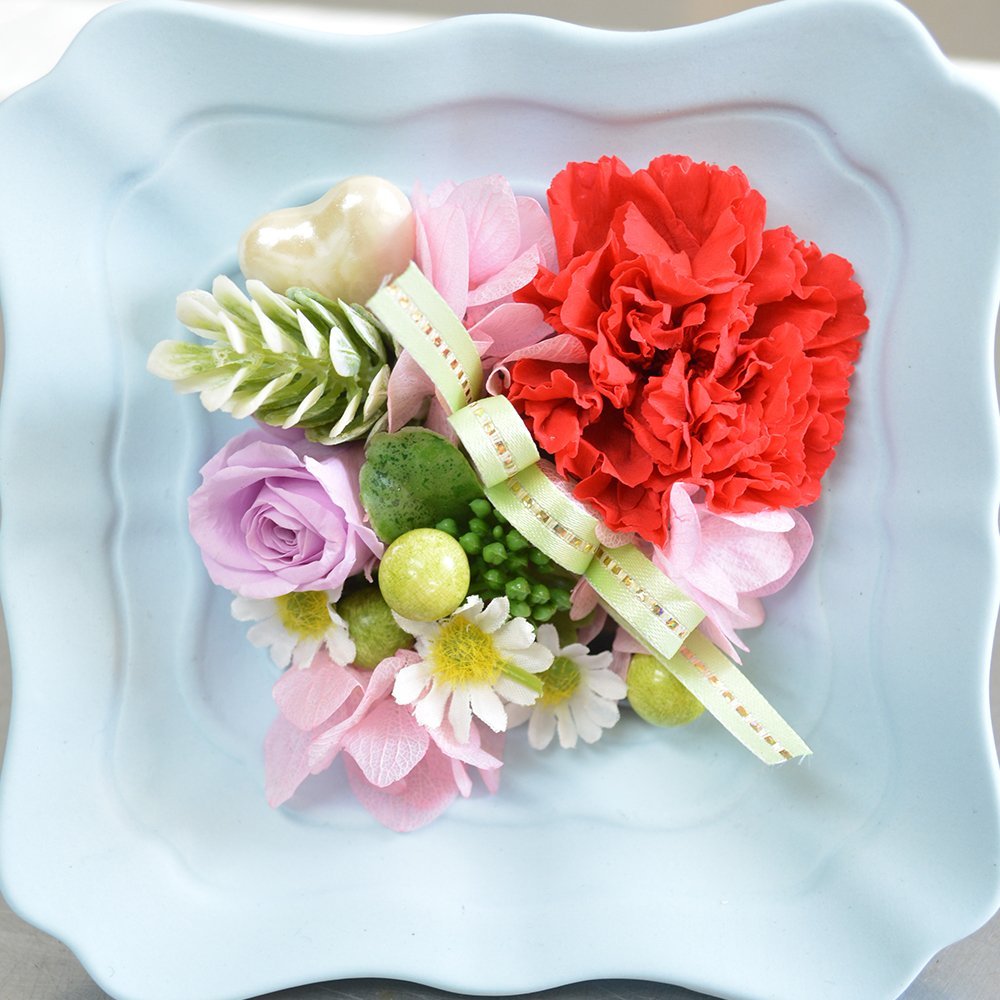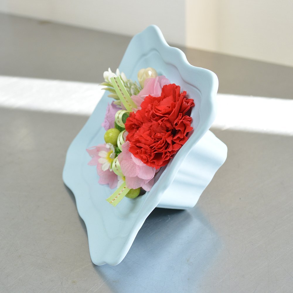 ★商品説明★縦、横に飾れるブルーの陶器にカーネーション、ミニバラ、アジサイ(プリザーブドフラワー)でアレンジしました。こちらの商品はクリアケース付となります。