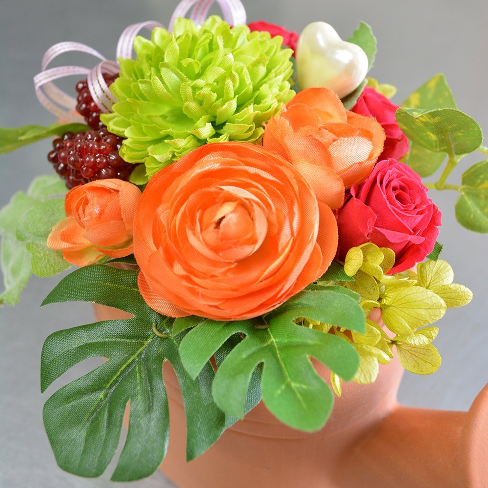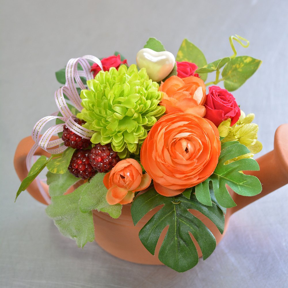 じょうろ型陶器 アーティフィシャルフラワー&ミニバラ(プリザーブドフラワー) アレンジメント フラワーギフト 花ギフト ブリザーブドフラワー