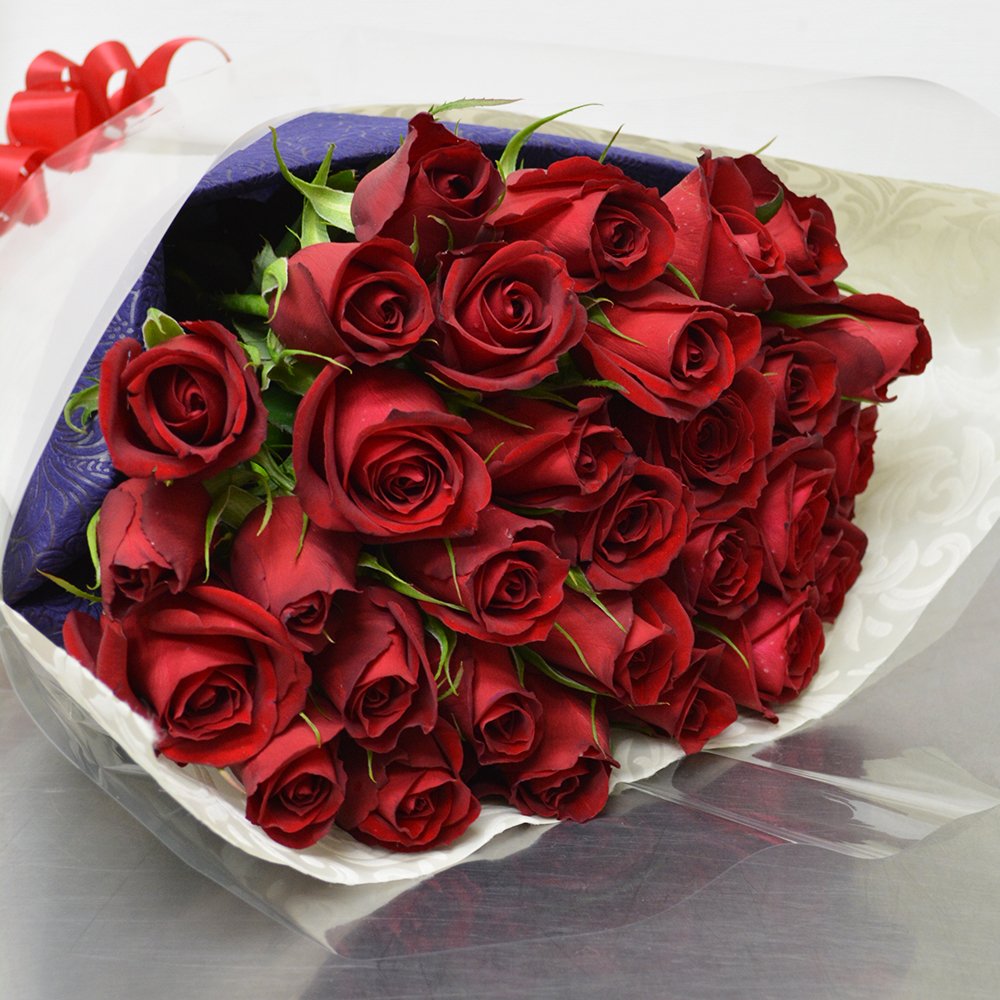 ☆商品説明:深紅のバラを使用した花束になります。お花が目立つよう白のラッピングにてお届けします。 ☆商品サイズ:横約20cm×高さ約40cm