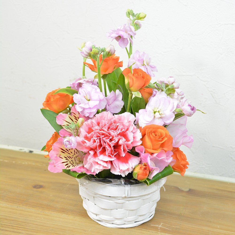 ★商品説明★お花・バスケットおまかせアレンジメントです。テーブルフラワー、プチギフトとしておすすめの商品です。