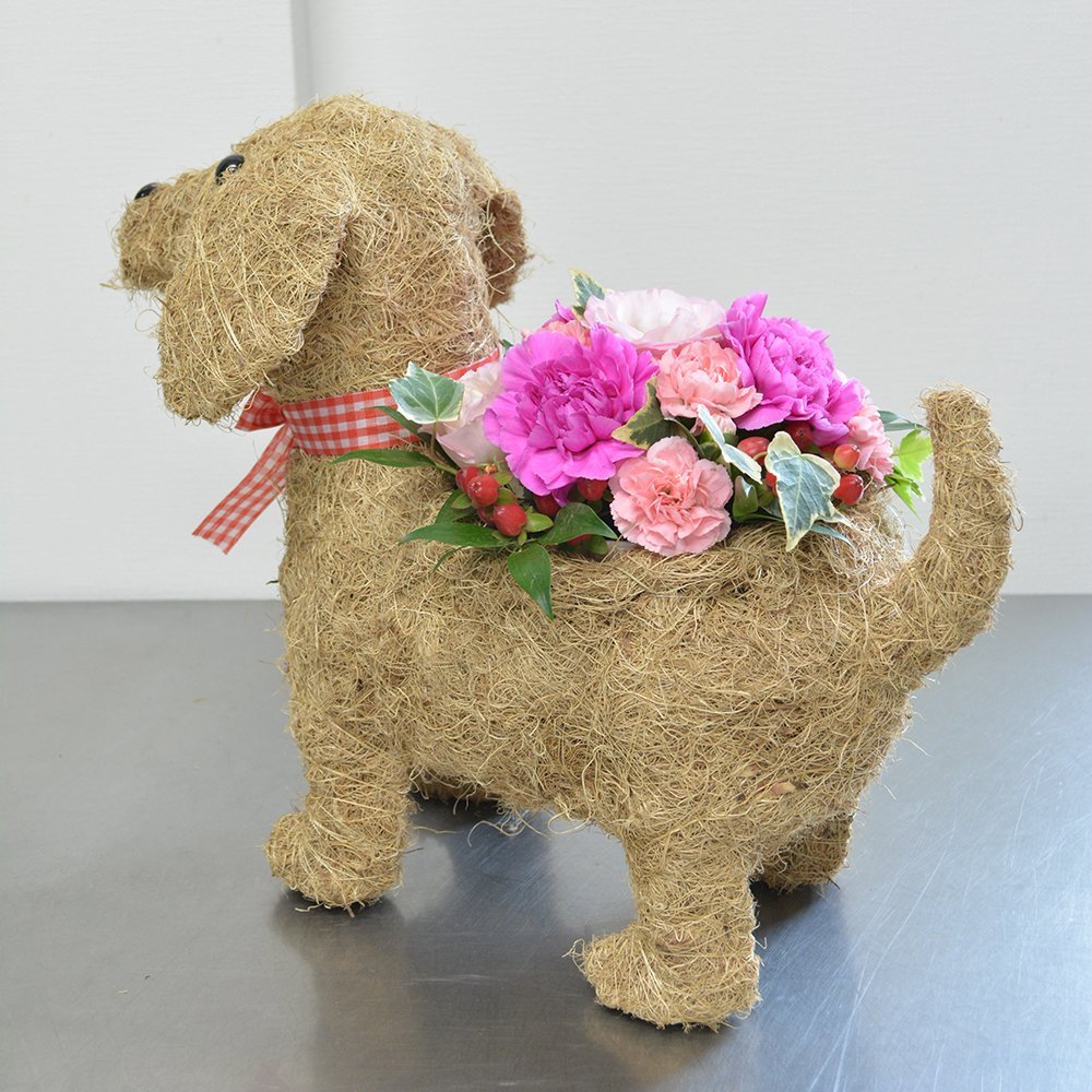 ★商品説明★犬型バスケットにピンク系カラーのお花をメインにしたアレンジメントです。母の日ピック付。お届け日は5月10日~14日にお届けいたします。日時指定可。★商品サイズ★横約35cm×高さ約28cm