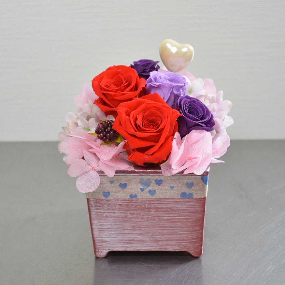 プリザーブドフラワー ピンクコンポート レッド&パープルバラ アレンジメント クリアケース付 フラワーギフト 花ギフト ブリザーブドフラワー