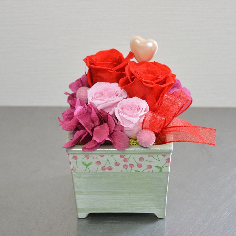 プリザーブドフラワー グリーンコンポート レッド&ピンクバラ アレンジメント クリアケース付 フラワーギフト 花ギフト ブリザーブドフラワー 母の日 ギフト
