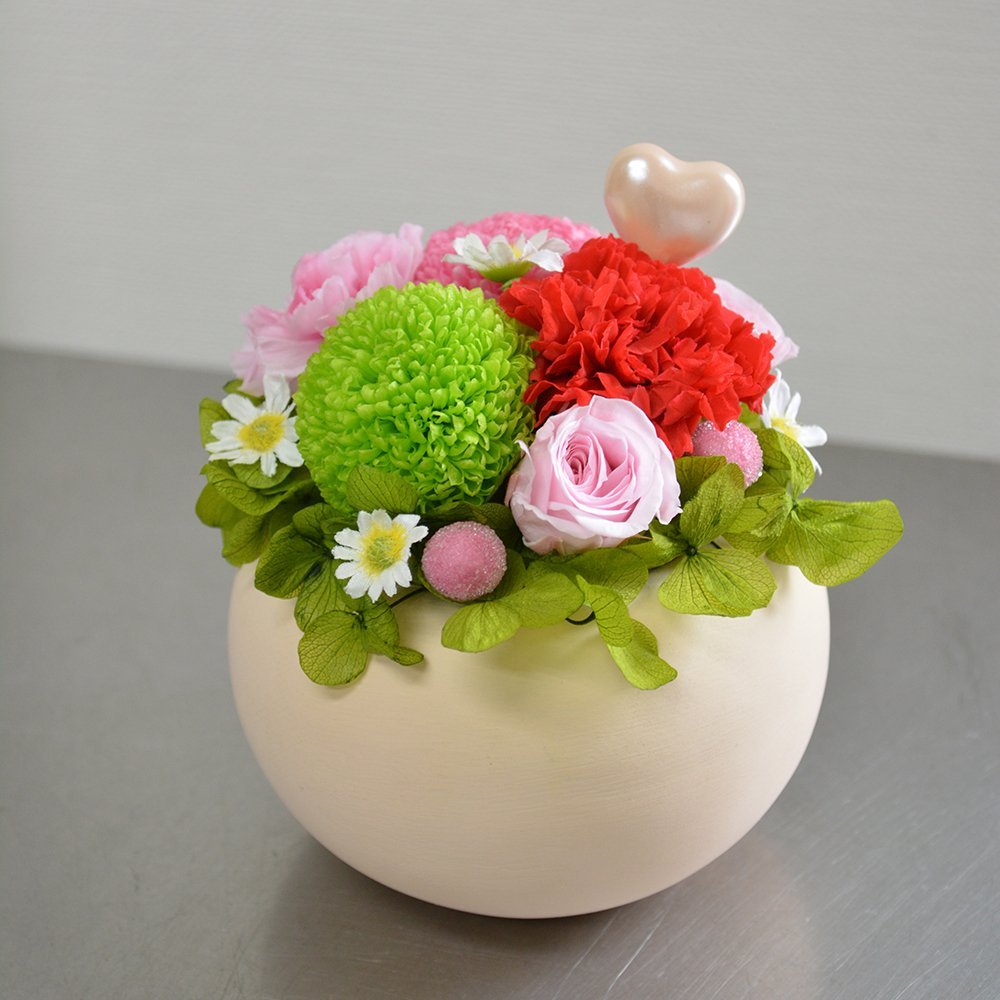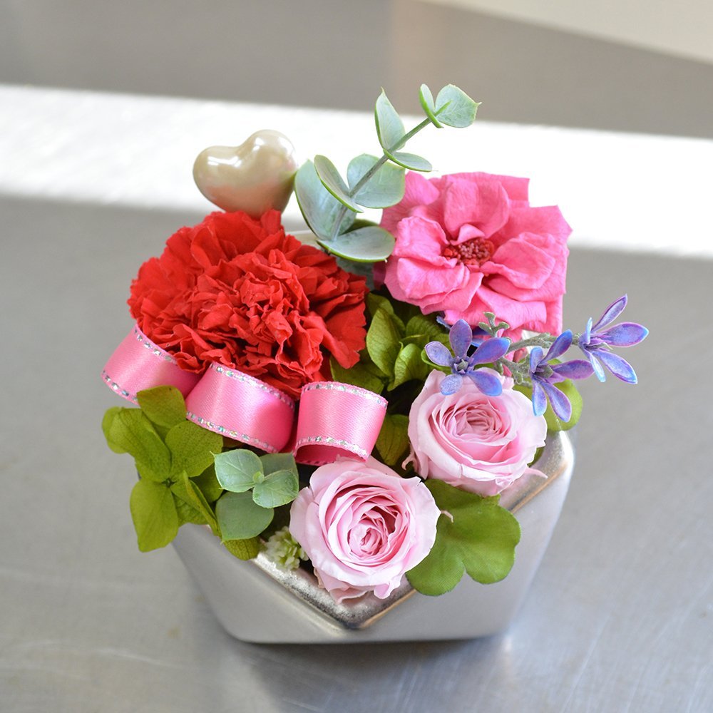 プリザーブドフラワー 多角形ポット カーネーション&バラ アレンジメント クリアケース付 フラワーギフト 花ギフト ブリザーブドフラワー 誕生日祝い 結婚祝い 母の日