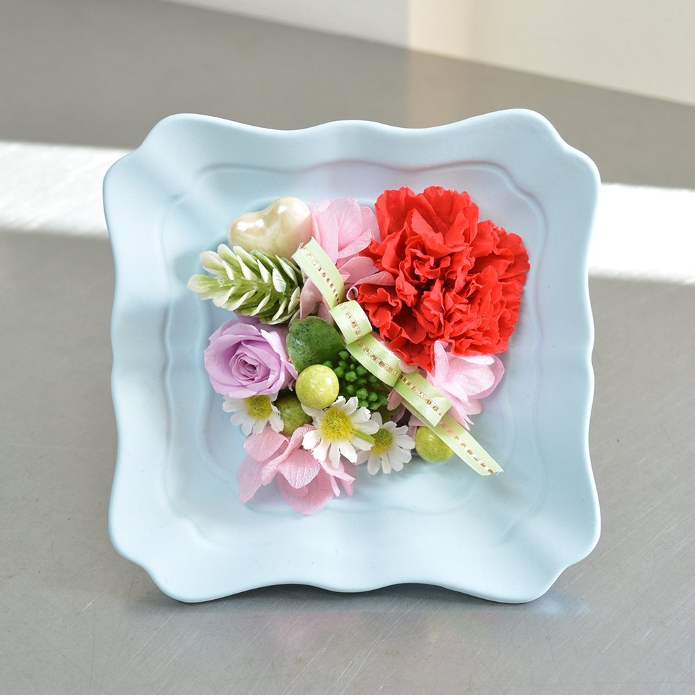 プリザーブドフラワー 縦・横2WAY カーネーション&バラ ブルー陶器 アレンジメント クリアケース付 フラワーギフト 花ギフト ブリザーブドフラワー 誕生日祝い 結婚祝い 母の日 プレゼント